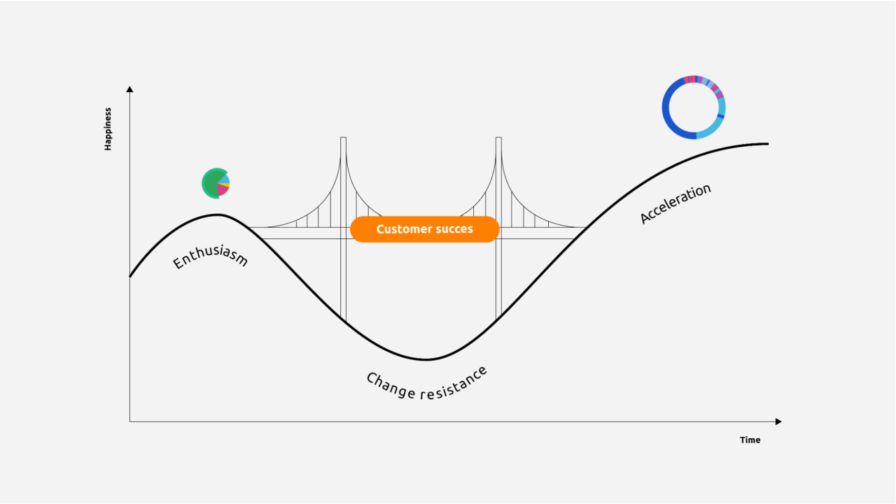 - Journée de lancement : Au cours de cette journée, nous impliquons les collaborateurs de votre choix. Ils rencontrent le Customer Success Professional, peuvent poser des questions et discutent de divers sujets, comme l'automatisation, les options de contrôle, l'impact sur le travail, l'accompagnement dans l'implémentation, la différence entre Customer Success et Customer Support, etc.